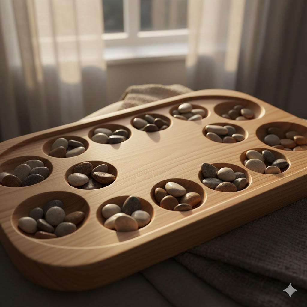 Kalaha är den moderna bordsvarianten av samma idé, ett träbräde med 14 gropar och 48 kulor som flyttas runt i ett jämnt, nästan rytmiskt tempo.